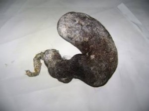 El tracto gastrointestinal humano no tiene capacidad para digerir el cabello, así que este tiende a permanecer en el estómago durante un período de tiempo prolongado formando una gran bola de pelo, por lo que la única forma de extraerlo es quirúrgicamente.