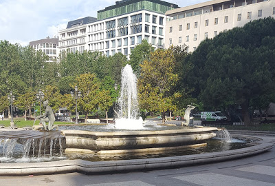 La plaza llama por la atención porque lo primero que se ve de ella es una fuente con dos figuras romanas en los los laterales… esta es la central a la plaza .