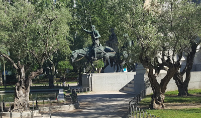 La sorpresa esta al otro lado de este pedestal . en este lado del pedestal podemos ver a la figura de D. Quijote y Sancho Panza . esta conjunto ecuestre es un homenaje al Quijote , Miguel de Cervantes y al castellano como lengua común .